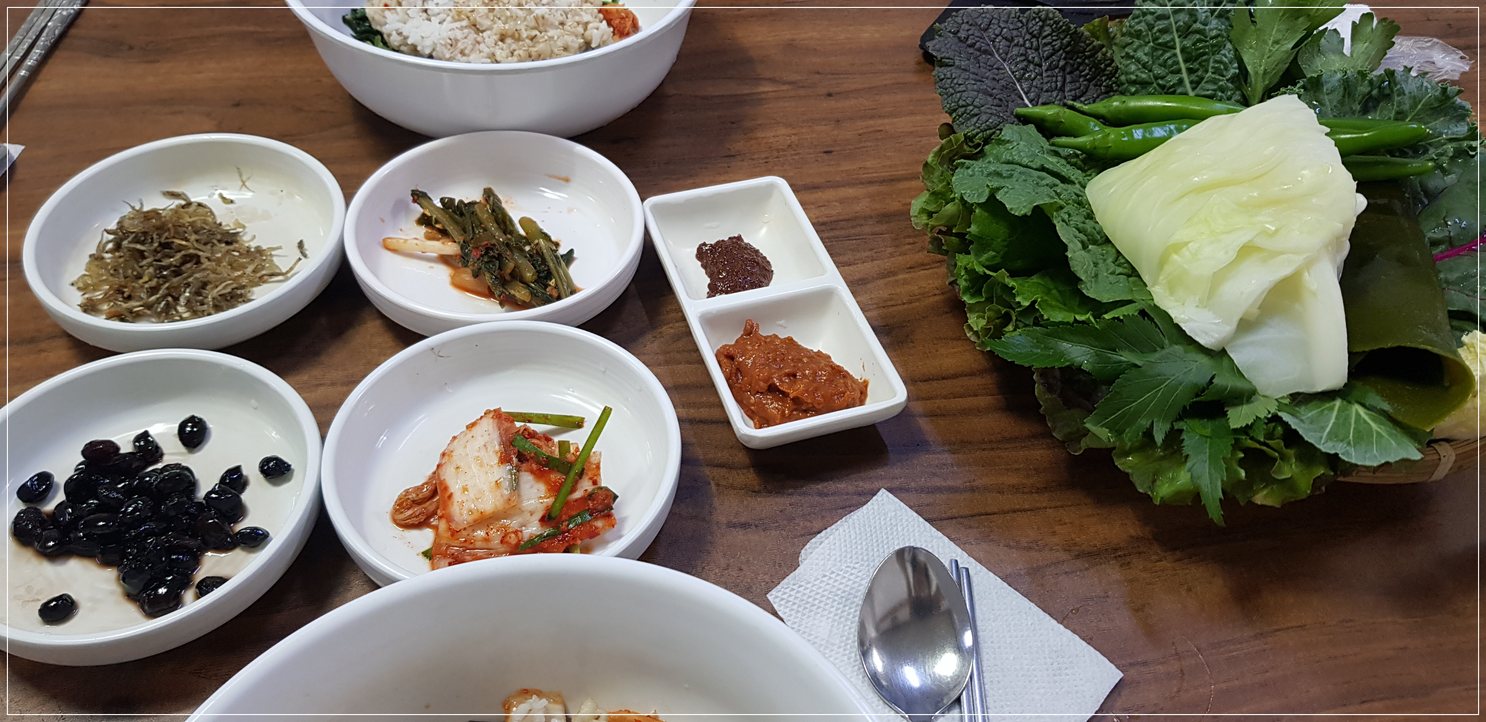 야채 쌈에는 양배우, 상추, 청경채, 케일, 고추, 다시마 등등이 있어 건강식이예요.